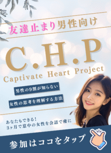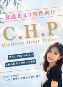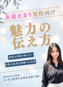 「女性との会話について、ネットの記事やアニメやドラマで優しい人、誠実な人が恋愛成就させているパターン」を真に受けて、いつも恋愛対象として見られなかった私の過去。知識も才能もない。そんな状態の私がどうやって3ヶ月で意中の女性を虜にする会話を身につけて、意中の女性と付き合い結婚することができ、楽しい毎日を過ごせているのか。その方法をあなたに伝授します。5分だけで構いません。静かな場所で集中して読んでみてください。そうすれば、あなたも3ヶ月後には女性の思考と恋愛の判断基準を完全に理解し、友人から「お似合いのカップルだね」と言われるような人間になっていることでしょう。